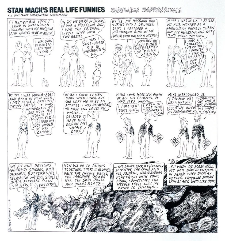 In “Indelible Impressions”, Renate and Tom are introduced by Mike via photos of their tattoos. This story takes place in the mid-1980s, when Mike was working from his studio on the Bowery.